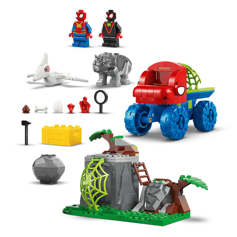 - Мініфігурки Павука та Майлза Моралеса, динозаври Павука-привида та Носорога, а також вантажівка