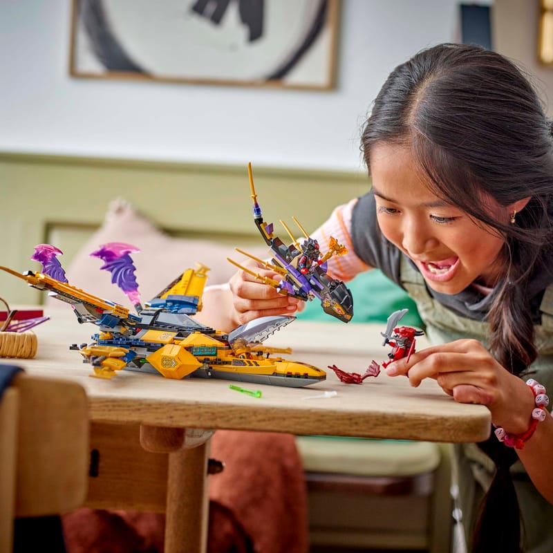 Об’єднайтеся з Аріном і Расом, щоб керувати суперштормовим реактивним літаком у хаотичному й похмурому небі над світом NINJAGO®! Допоможіть Аріну стріляти з пружинних шутерів реактивного літака. Допоможіть Расу від’єднати озброєний летючий дрон з головою дракона. Разом вони повинні знищити Воїна-дракона й драконячу істоту, переслідуючи їх крізь хмари. Хто переможе в цій жорстокій небесній битві?